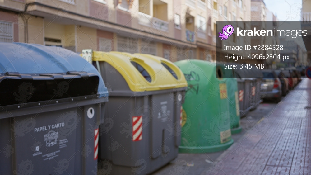 Row of recycling bins and parked cars in soft bokeh street background; background backplate copyspace calm.