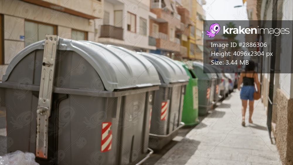 Row of street trash bins and parked cars in a soft blurred city street background with shallow focus and distant sidewalk; background backplate copyspace calm. - Kraken Images