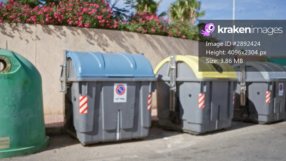 Row of urban recycling and waste bins in soft blurred bokeh focus along a sunny outdoor street background; background backplate copyspace template.