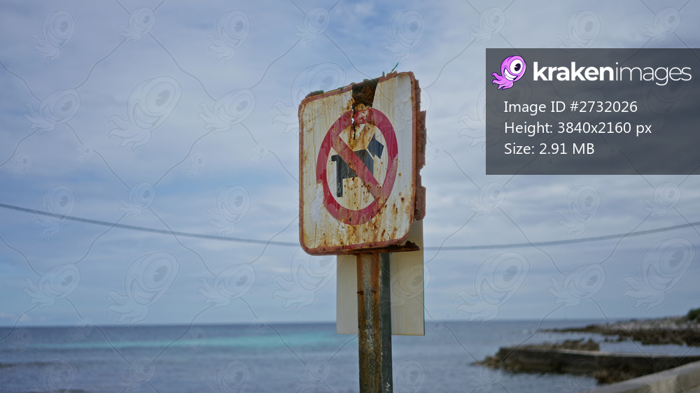 Rusted traffic sign prohibiting right turn stands alone on a coastal road against a serene ocean backdrop under a cloudy sky, highlighting urban decay in a natural setting. - Kraken Images