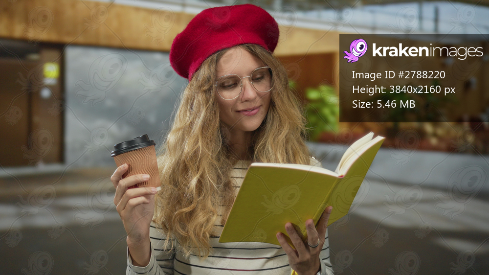 Scene captures a woman with a book reading in a cafe by a blonde young figure sipping coffee and adjusting glasses with an indoor smile.