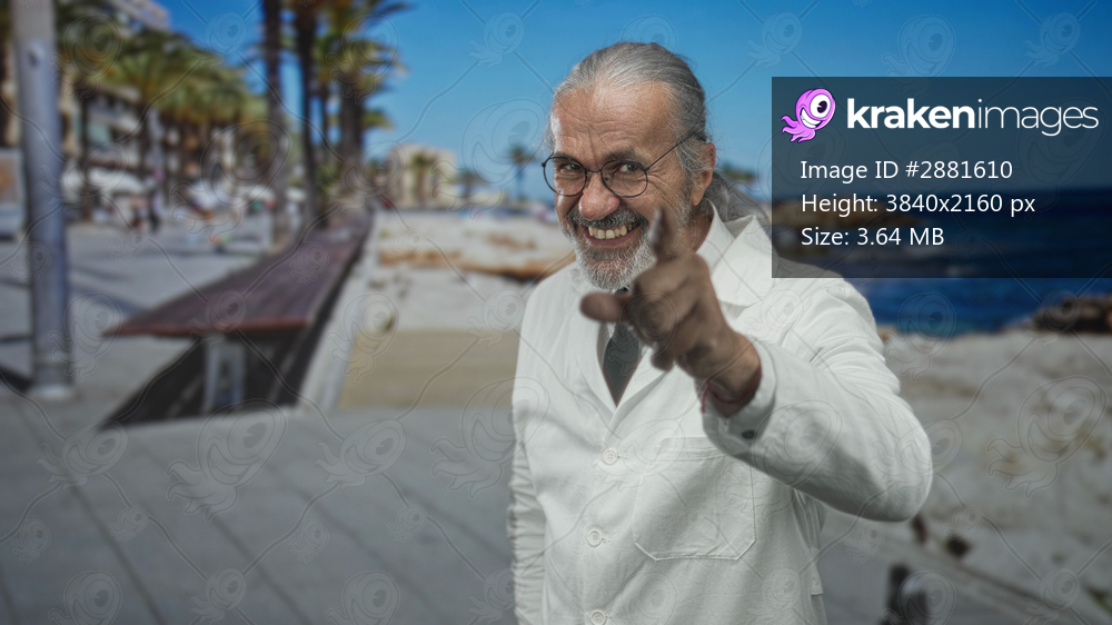 Scientist man in lab coat with long gray hair points finger at camera on seaside street promenade; confidence public science outreach.