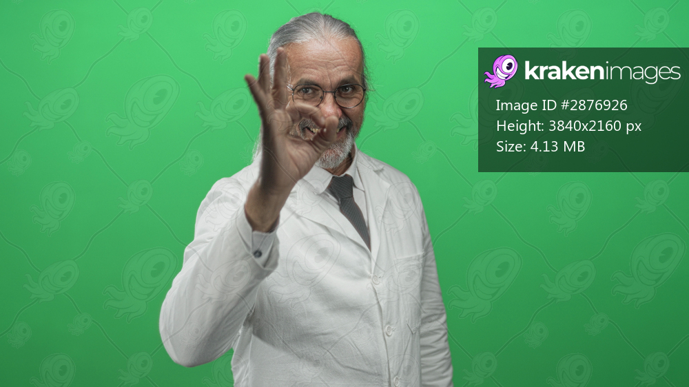 Scientist man in white lab coat making ok sign with right hand in studio green screen, wearing glasses and tie; approval confidence.
