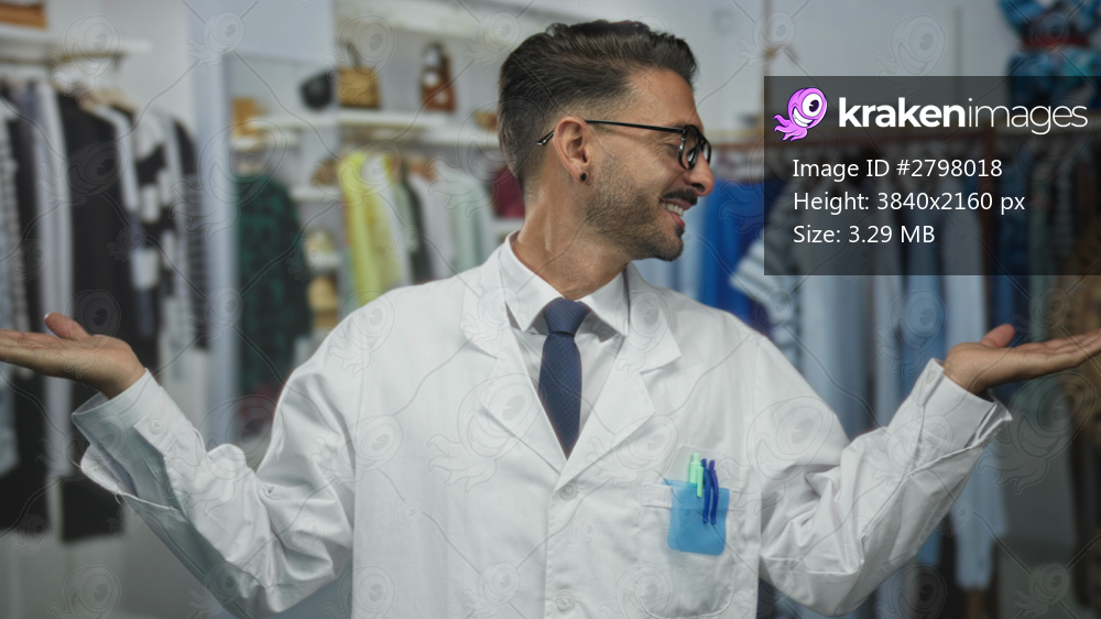 Scientist man wearing a white lab coat and tie presenting open hands inside a clothing store building; curiosity discovery innovation.