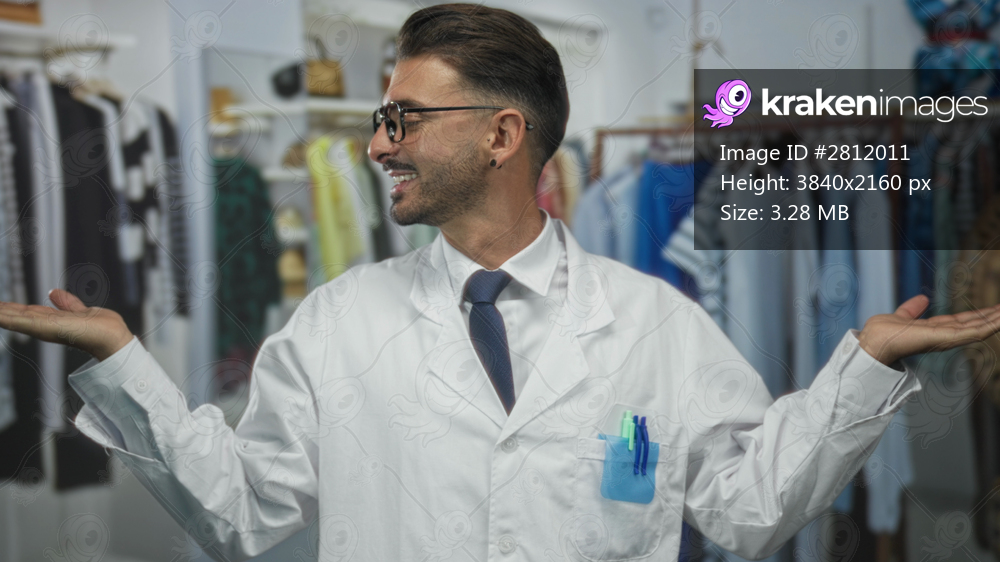 Scientist man wearing a white lab coat and tie presenting open hands inside a clothing store building; curiosity discovery innovation.