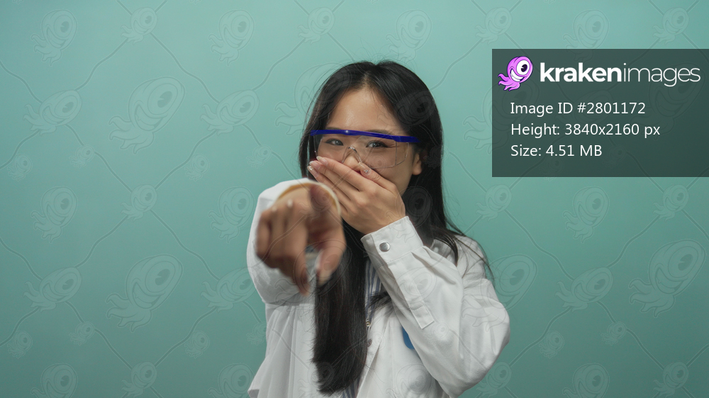 Scientist woman in a lab coat with glasses points playfully against an isolated blue background wall.