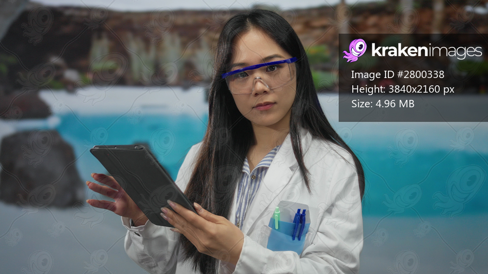 Scientist woman in uniform working on tablet by outdoor pool at resort hotel showcasing innovation in a unique setting with a modern twist on traditional research environments. - Kraken Images