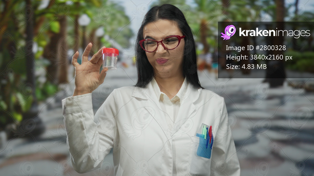 Scientist woman wearing glasses and lab coat examines test tube outdoors on sunny street bustling with people.