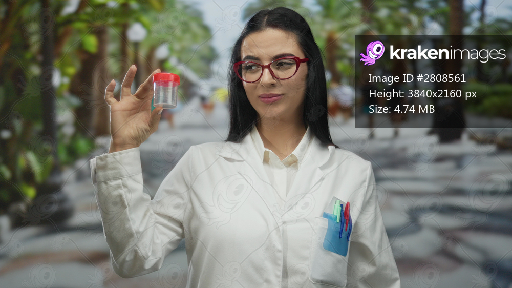 Scientist woman wearing glasses and lab coat examines test tube outdoors on sunny street bustling with people.