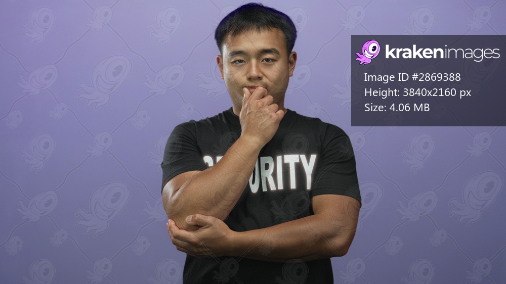 Security man wearing black security shirt places one hand on chin with thoughtful posture in purple studio; contemplation.