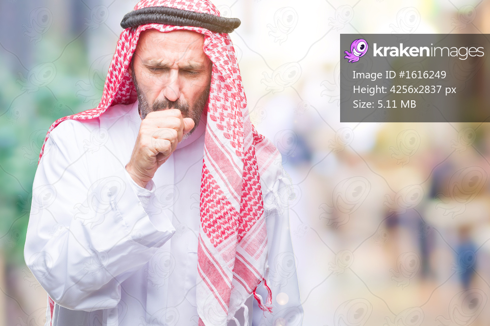 Senior arab man wearing keffiyeh over isolated background feeling unwell and coughing as symptom for cold or bronchitis. Healthcare concept.