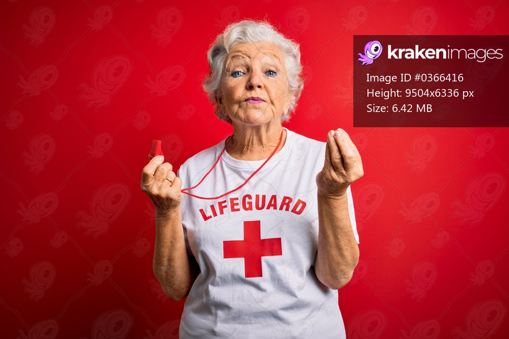 Senior beautiful grey-haired lifeguard woman wearing t-shirt with red cross using whistle doing money gesture with hands, asking for salary payment, millionaire business - Kraken Images