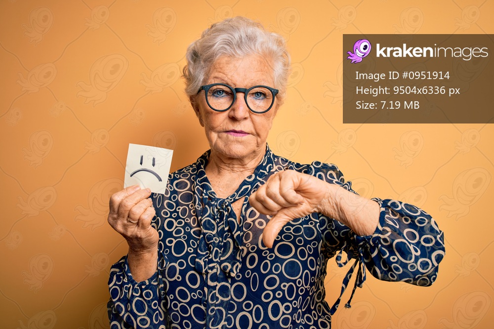 Senior beautiful grey-haired woman holding reminder paper with sad emotion face with angry face, negative sign showing dislike with thumbs down, rejection concept - Kraken Images