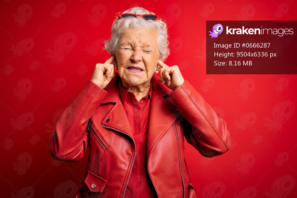 Senior beautiful grey-haired woman wearing casual red jacket and sunglasses covering ears with fingers with annoyed expression for the noise of loud music. Deaf concept. - Kraken Images