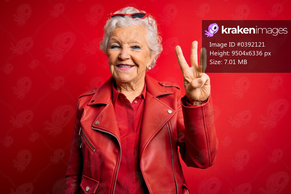 Senior beautiful grey-haired woman wearing casual red jacket and sunglasses showing and pointing up with fingers number three while smiling confident and happy. - Kraken Images