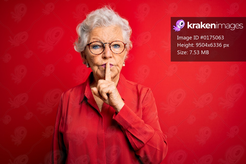 Senior beautiful grey-haired woman wearing casual shirt and glasses over red background asking to be quiet with finger on lips. Silence and secret concept. - Kraken Images