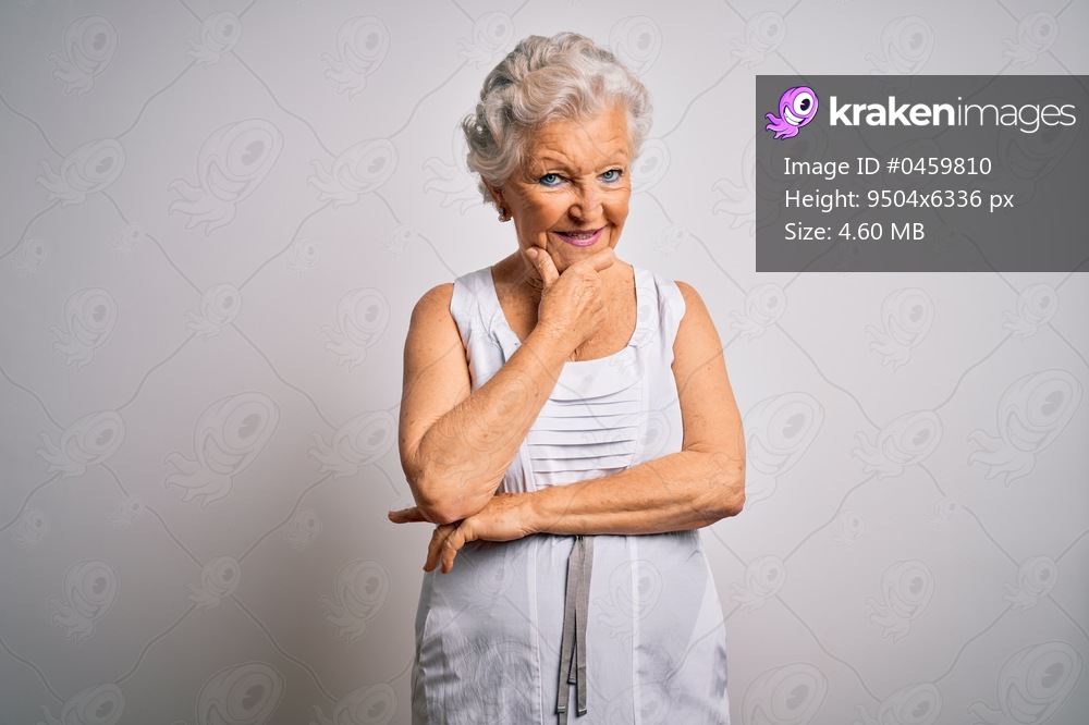 Senior beautiful grey-haired woman wearing casual summer dress over white background looking confident at the camera smiling with crossed arms and hand raised on chin. Thinking positive. - Kraken Images