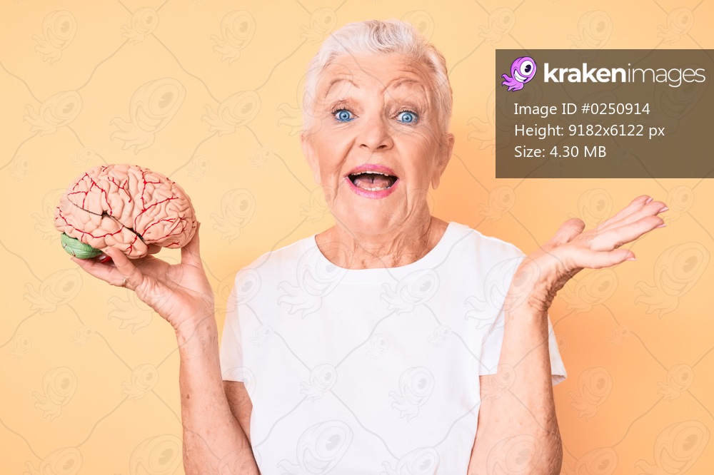 Senior beautiful woman with blue eyes and grey hair holding brain as mental health concept celebrating victory with happy smile and winner expression with raised hands - Kraken Images