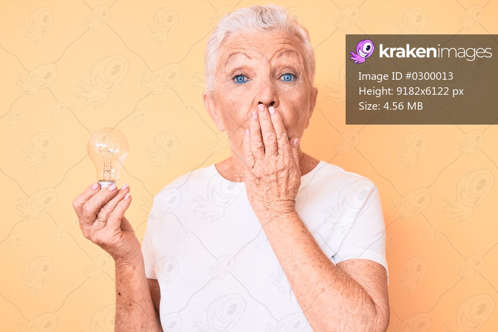 Senior beautiful woman with blue eyes and grey hair holding lightbulb for inspiration and idea covering mouth with hand, shocked and afraid for mistake. surprised expression - Kraken Images