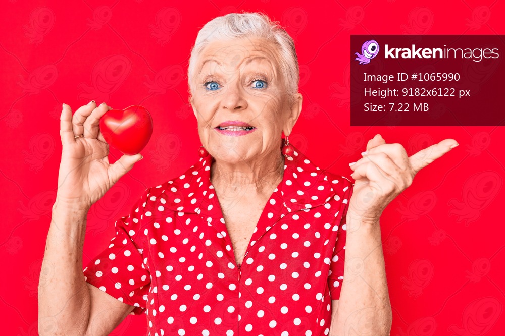Senior beautiful woman with blue eyes and grey hair holding read heart object smiling happy pointing with hand and finger to the side