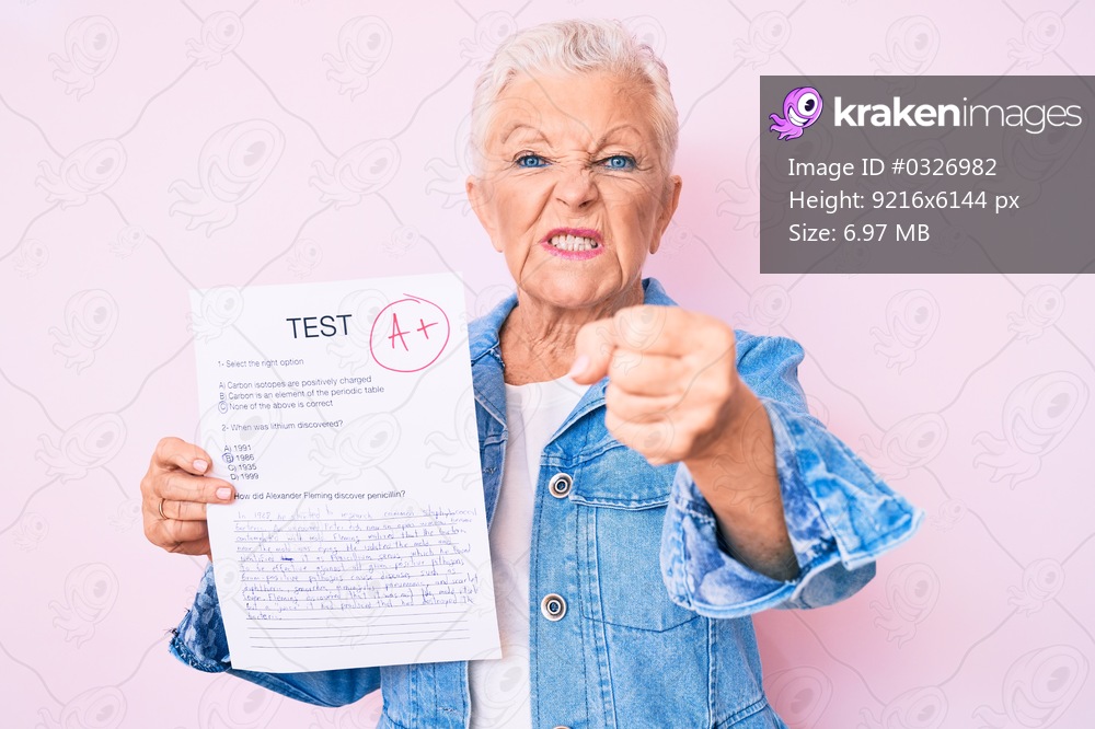 Senior beautiful woman with blue eyes and grey hair showing a passed exam annoyed and frustrated shouting with anger, yelling crazy with anger and hand raised - Kraken Images