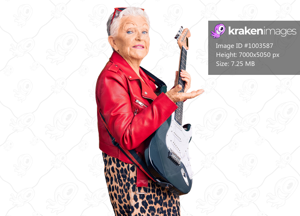Senior beautiful woman with blue eyes and grey hair wearing a modern look playing electric guitar pointing aside with hands open palms showing copy space, presenting advertisement smiling excited happy - Kraken Images