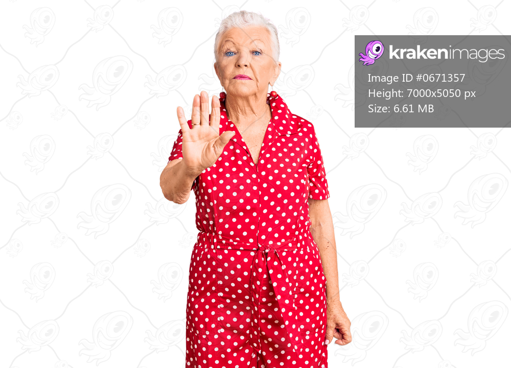 Senior beautiful woman with blue eyes and grey hair wearing a red summer dress doing stop sing with palm of the hand. warning expression with negative and serious gesture on the face. - Kraken Images