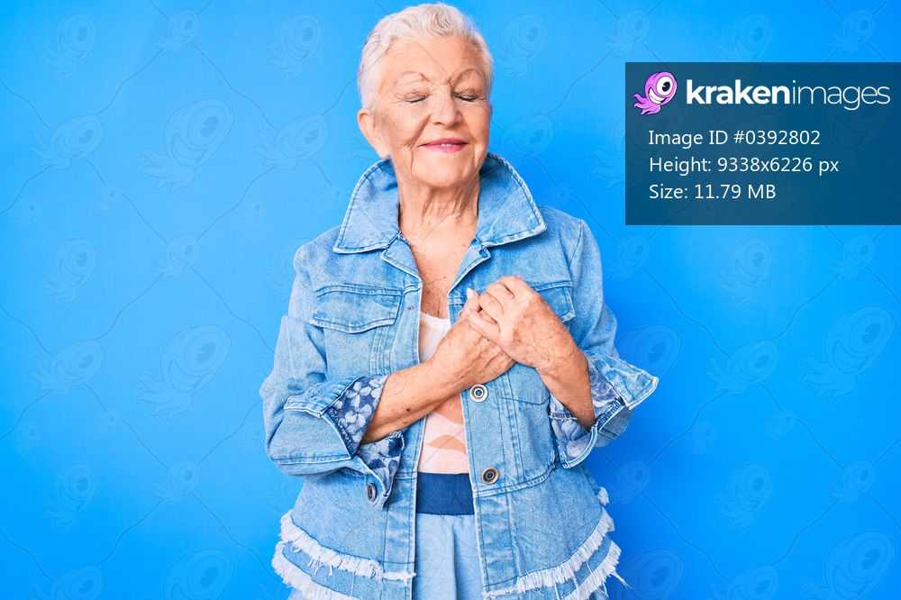Senior beautiful woman with blue eyes and grey hair wearing casual denim style smiling with hands on chest with closed eyes and grateful gesture on face. health concept. - Kraken Images