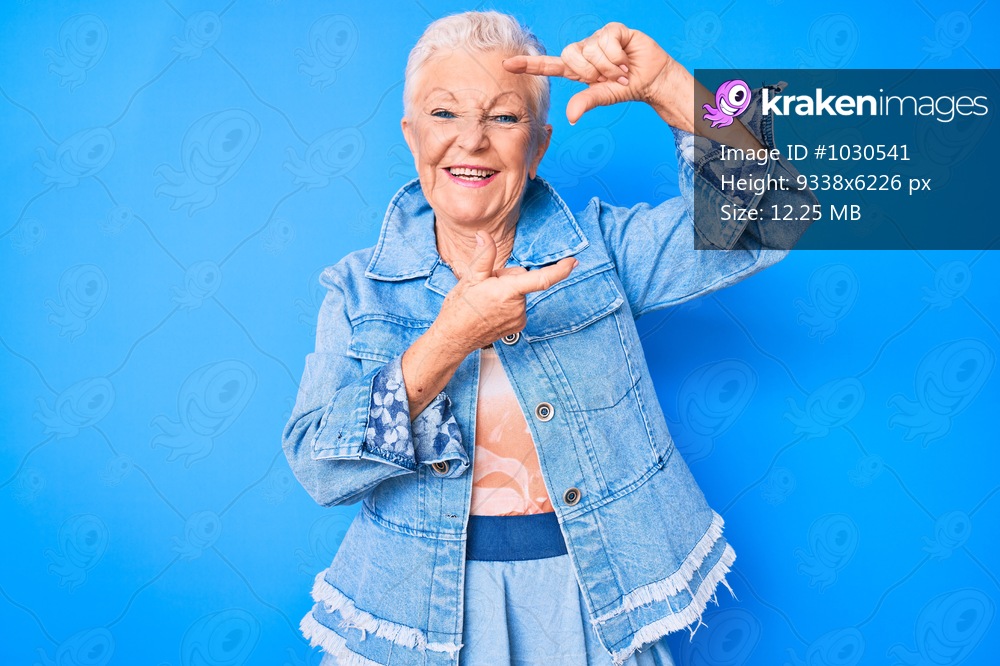 Senior beautiful woman with blue eyes and grey hair wearing casual denim style smiling making frame with hands and fingers with happy face. creativity and photography concept. - Kraken Images
