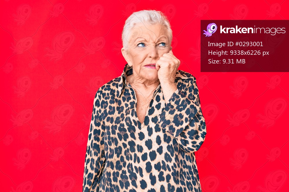 Senior beautiful woman with blue eyes and grey hair wearing casual and modern leopard animal print shirt looking stressed and nervous with hands on mouth biting nails. anxiety problem. - Kraken Images