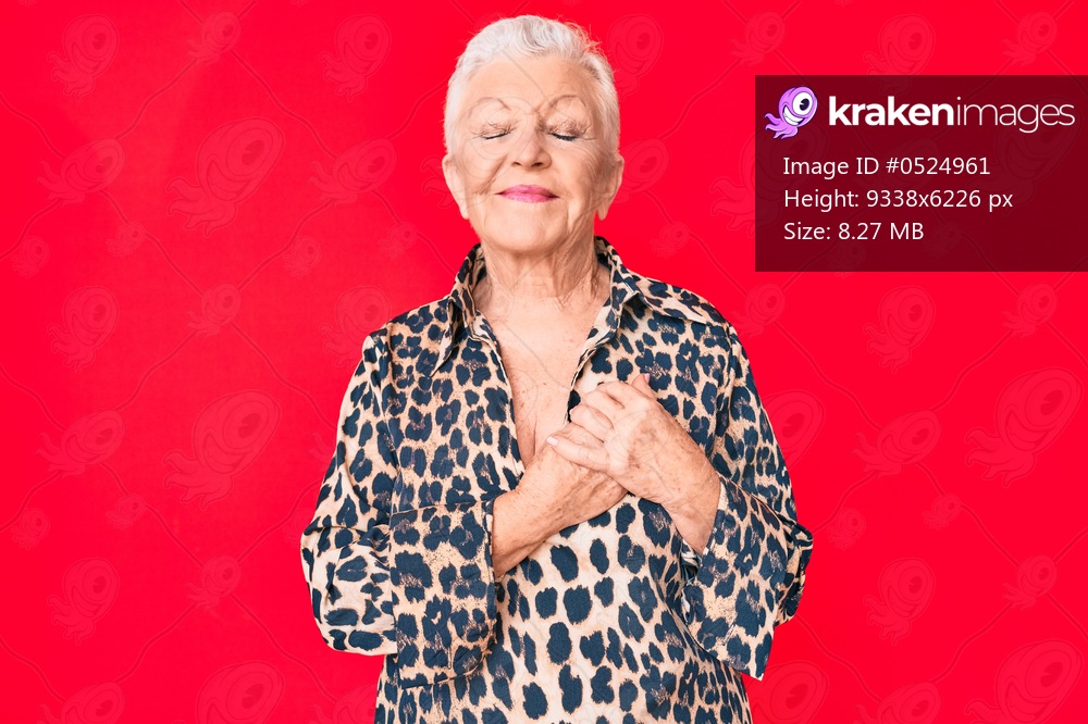 Senior beautiful woman with blue eyes and grey hair wearing casual and modern leopard animal print shirt smiling with hands on chest with closed eyes and grateful gesture on face. health concept. - Kraken Images