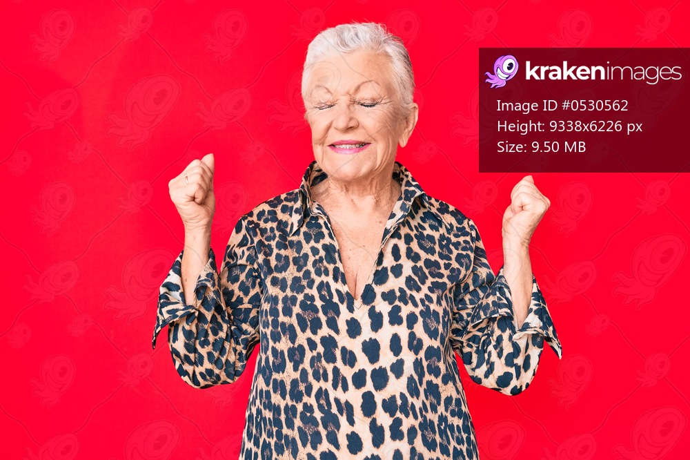 Senior beautiful woman with blue eyes and grey hair wearing casual and modern leopard animal print shirt very happy and excited doing winner gesture with arms raised, smiling and screaming for success. celebration concept. - Kraken Images