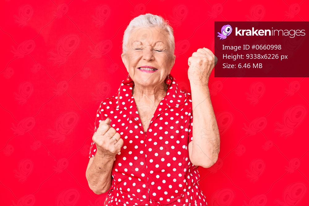 Senior beautiful woman with blue eyes and grey hair wearing casual summer clothes over red background celebrating surprised and amazed for success with arms raised and eyes closed - Kraken Images