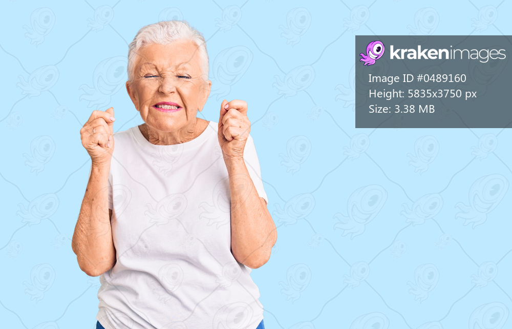 Senior beautiful woman with blue eyes and grey hair wearing casual white tshirt gesturing finger crossed smiling with hope and eyes closed. luck and superstitious concept. - Kraken Images