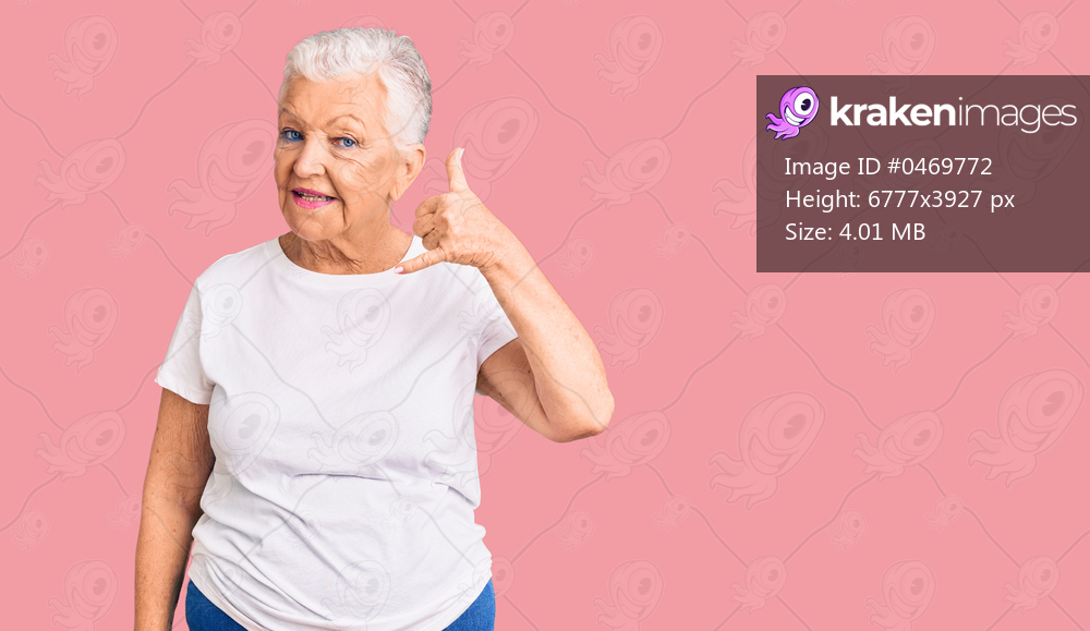 Senior beautiful woman with blue eyes and grey hair wearing casual white tshirt smiling doing phone gesture with hand and fingers like talking on the telephone. communicating concepts. - Kraken Images