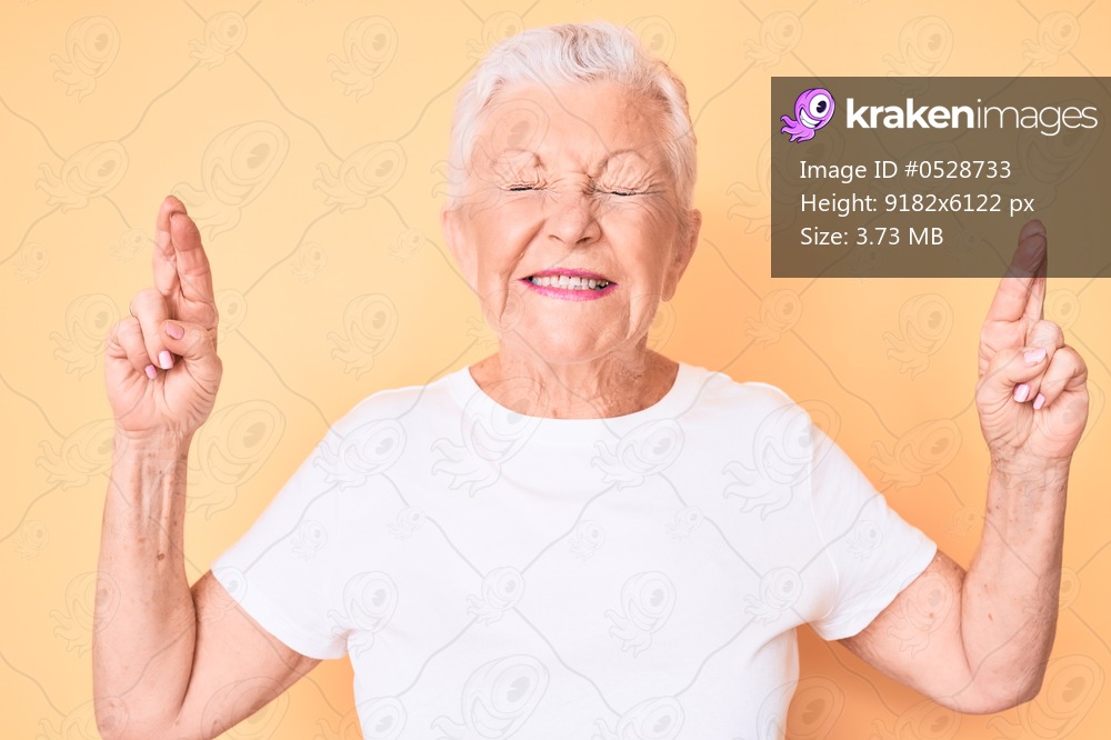 Senior beautiful woman with blue eyes and grey hair wearing classic white tshirt over yellow background gesturing finger crossed smiling with hope and eyes closed. luck and superstitious concept. - Kraken Images