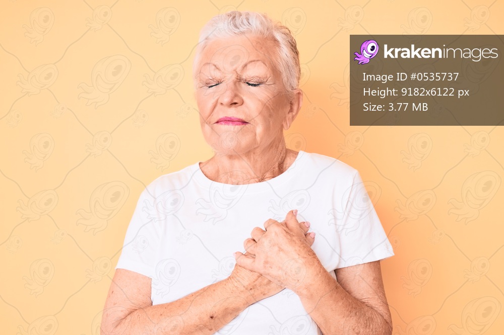 Senior beautiful woman with blue eyes and grey hair wearing classic white tshirt over yellow background smiling with hands on chest with closed eyes and grateful gesture on face. health concept. - Kraken Images