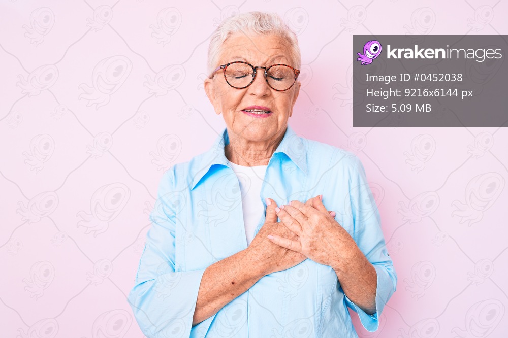 Senior beautiful woman with blue eyes and grey hair wearing glasses smiling with hands on chest with closed eyes and grateful gesture on face. health concept. - Kraken Images