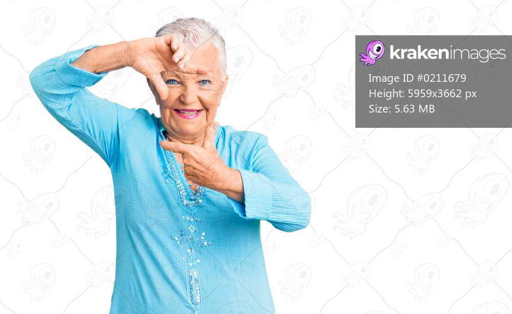 Senior beautiful woman with blue eyes and grey hair wearing summer dress smiling making frame with hands and fingers with happy face. creativity and photography concept. - Kraken Images