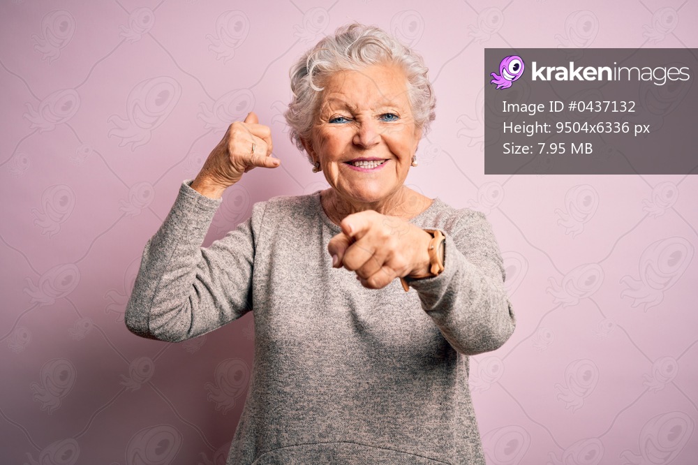 Senior beautiful woman wearing casual t-shirt standing over isolated pink background smiling doing talking on the telephone gesture and pointing to you. Call me.