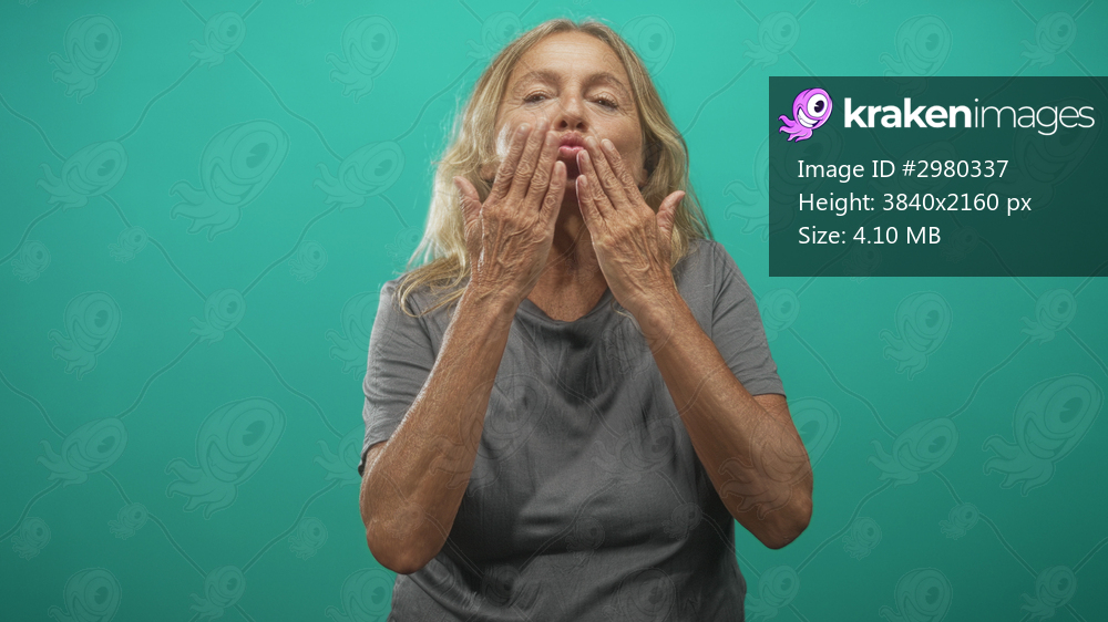 Senior blonde woman blows kiss with hands near mouth in studio with teal backdrop and gray shirt; affection connection.