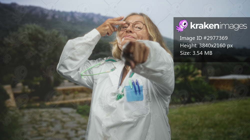 Senior blonde woman doctor pointing finger and touching temple with stethoscope in forest; confidence authority.