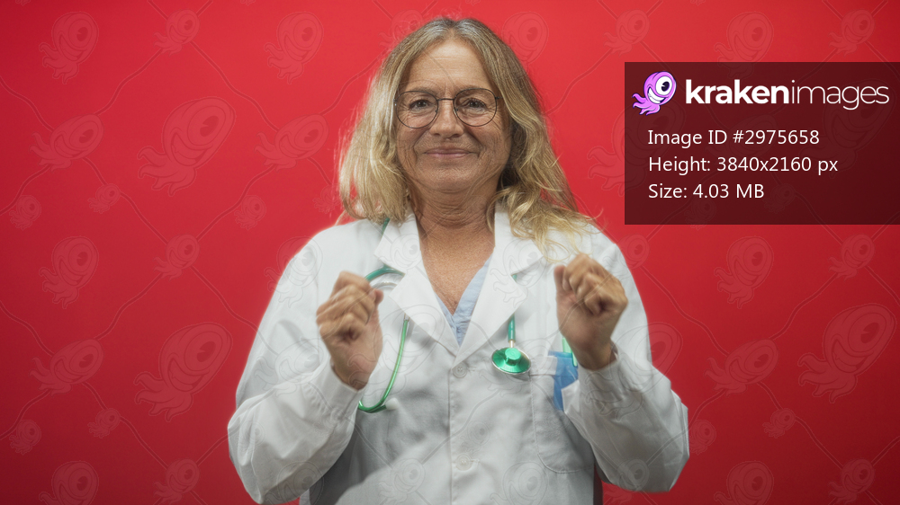 Senior blonde woman doctor smiling makes heart shape with hands, green stethoscope visible, studio red backdrop; compassion care.