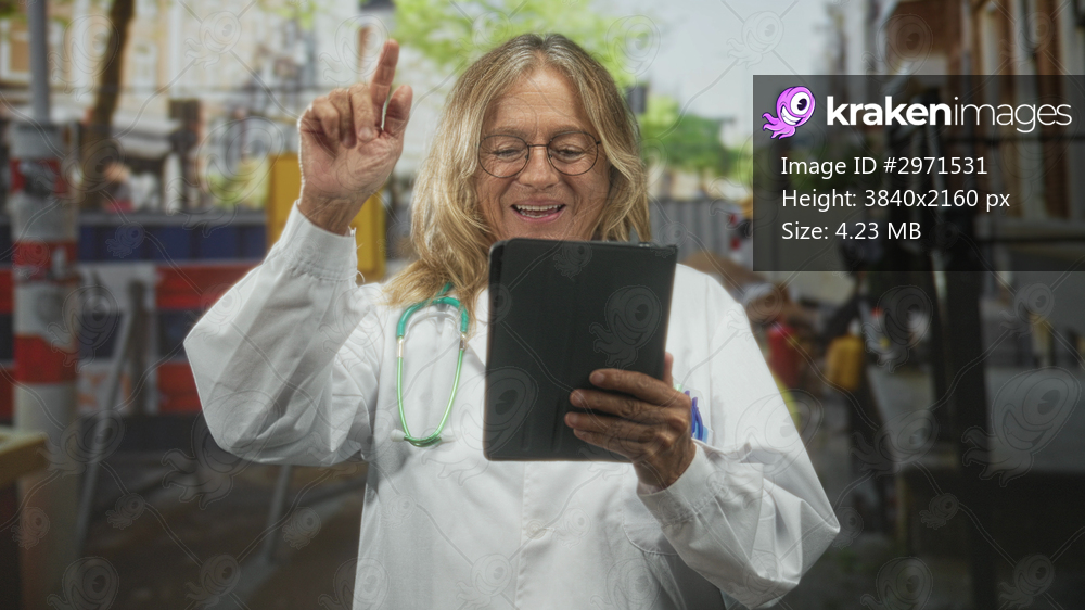 Senior blonde woman doctor wearing white coat and stethoscope, tapping tablet with bare hand and smiling, on urban street with construction signs visible; focused telemedicine care. - Kraken Images