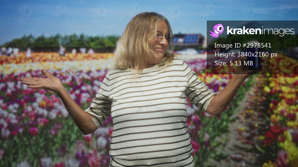 Senior blonde woman with glasses and striped shirt holds blue pill bottle in right hand and shrugs palm up in studio with floral backdrop; health uncertainty. - Kraken Images