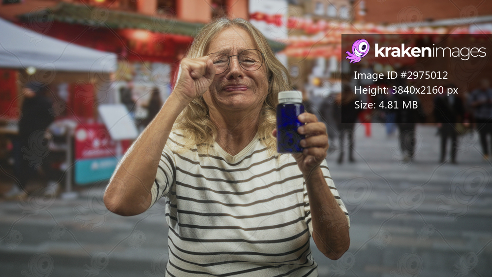 Senior blonde woman holding blue medicine bottle in hand while rubbing eye and squinting on crowded city street market; health concern.