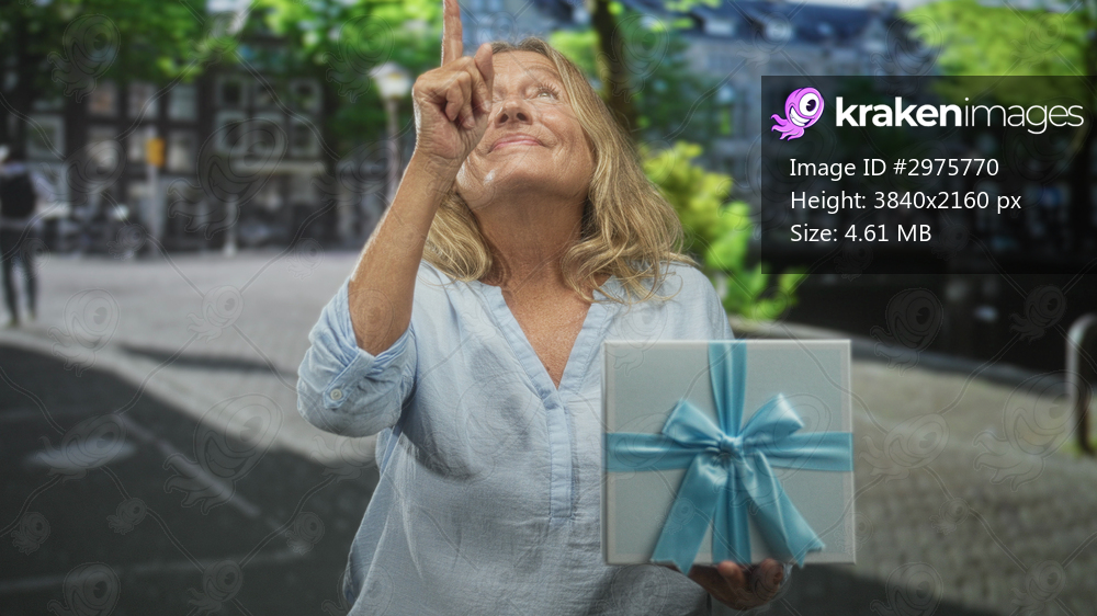 Senior blonde woman holding white gift box with blue ribbon points index finger upward while smiling on a cobblestone street; hopeful celebration.