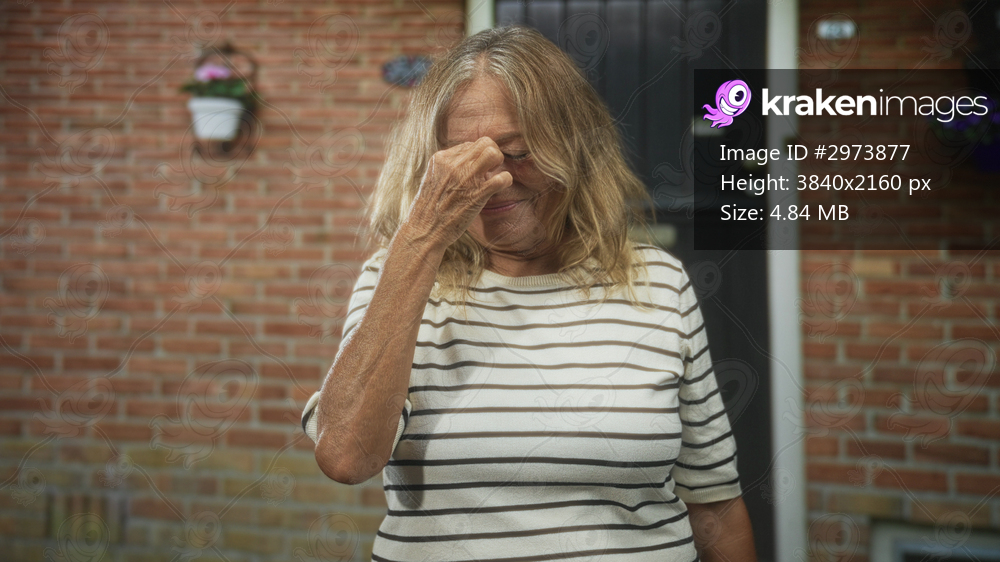 Senior blonde woman pinches bridge of nose with hand outside brick building entrance near hanging flowers; relief.