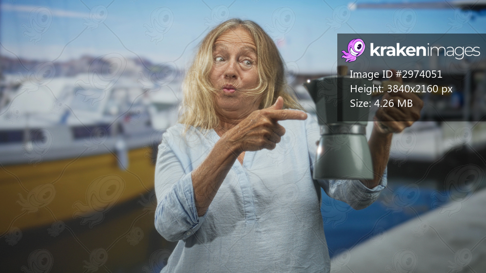 Senior blonde woman points finger at stovetop coffee maker held in her right hand in studio set with marina backdrop; playful surprise.