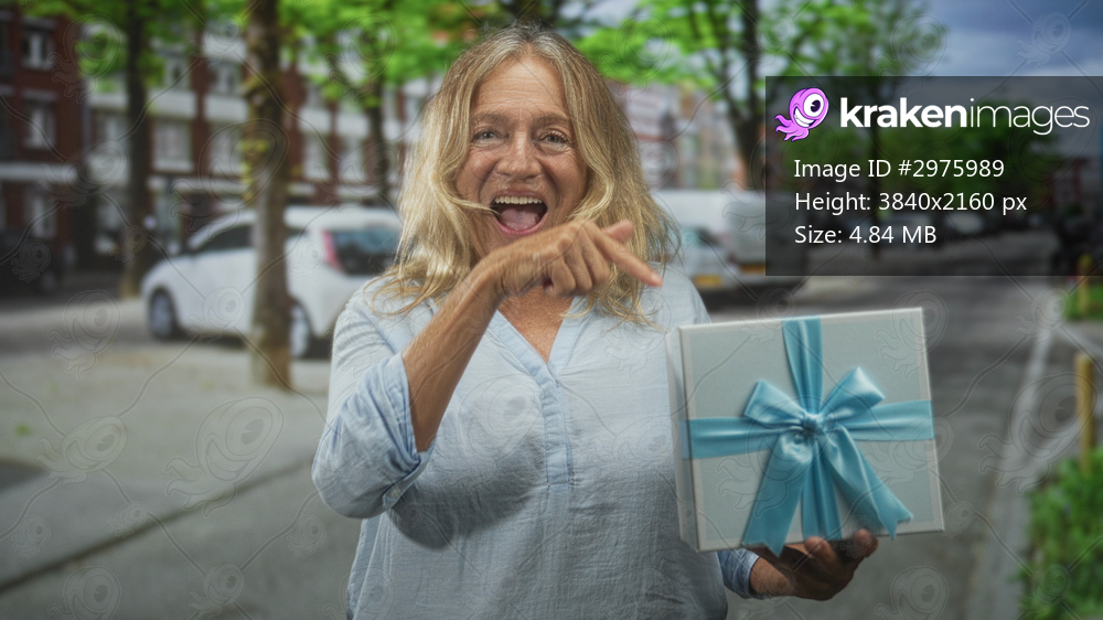 Senior blonde woman points finger to gift box while holding present on a street, smiling; happy celebration.